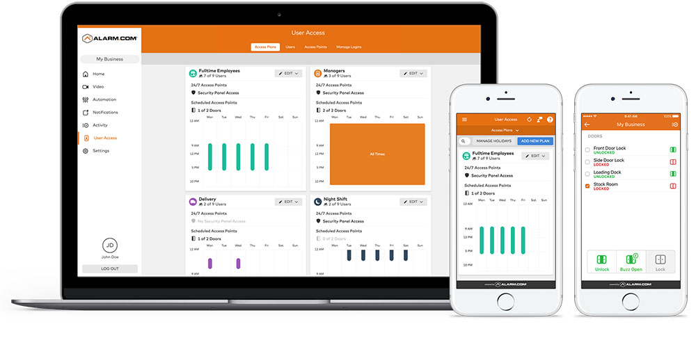 Our fully-integrated solution allows you to monitor and control your business through a single, mobile-friendly interface. With just a few clicks, you can secure your system, view live-streaming video, manage employee access, regulate energy use and much more.